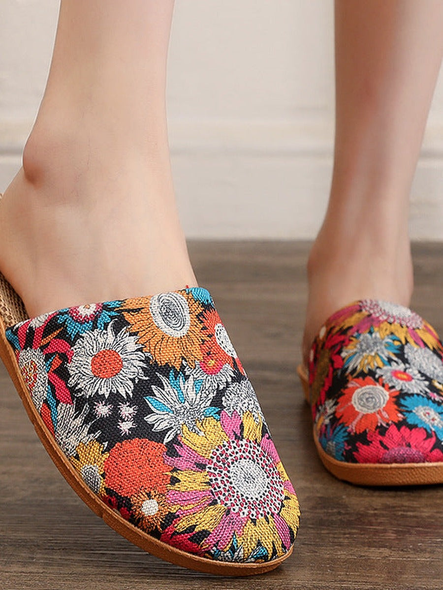 Pantoufles d'été pour femmes en lin imprimé floral à bout ouvert