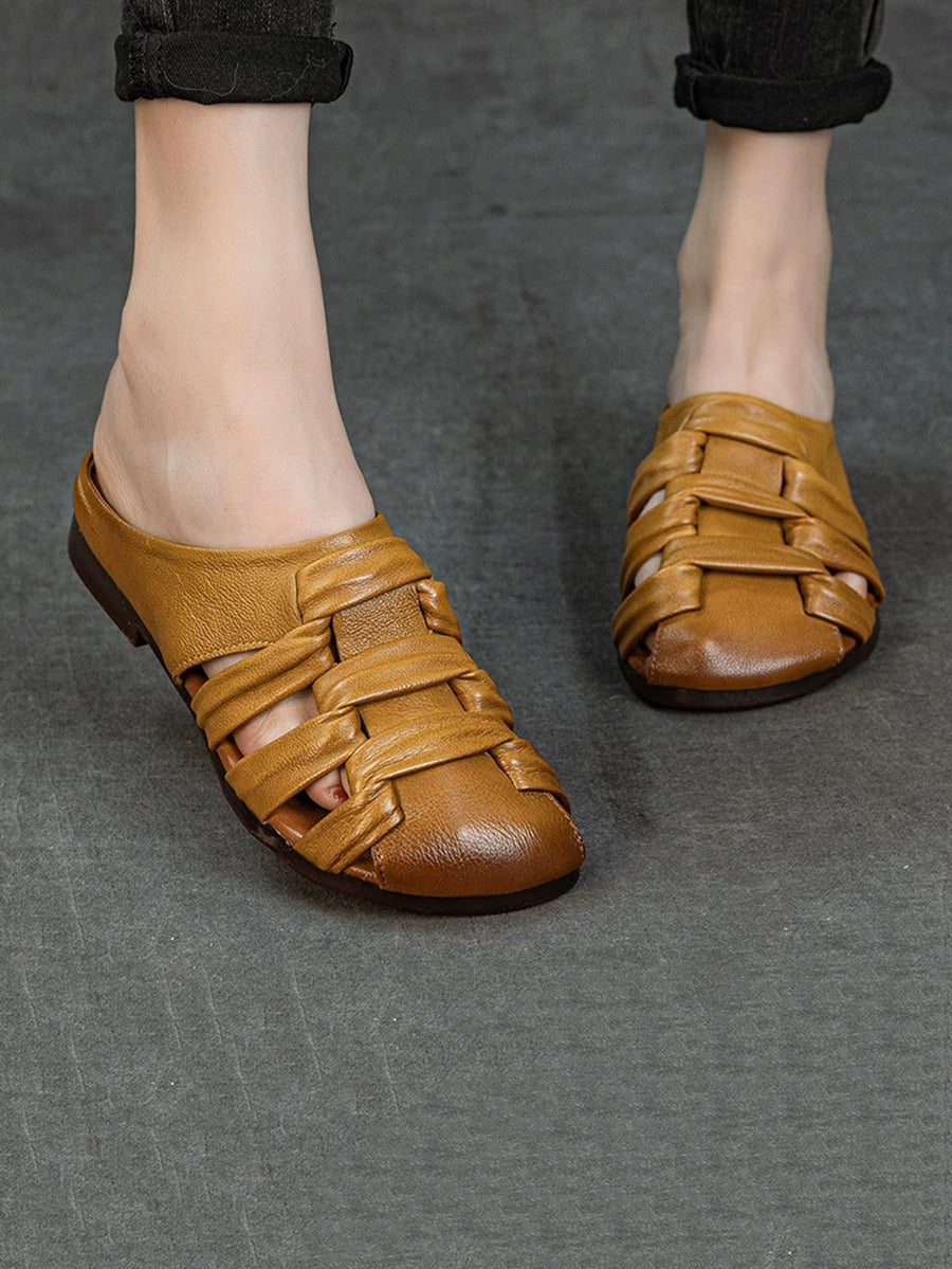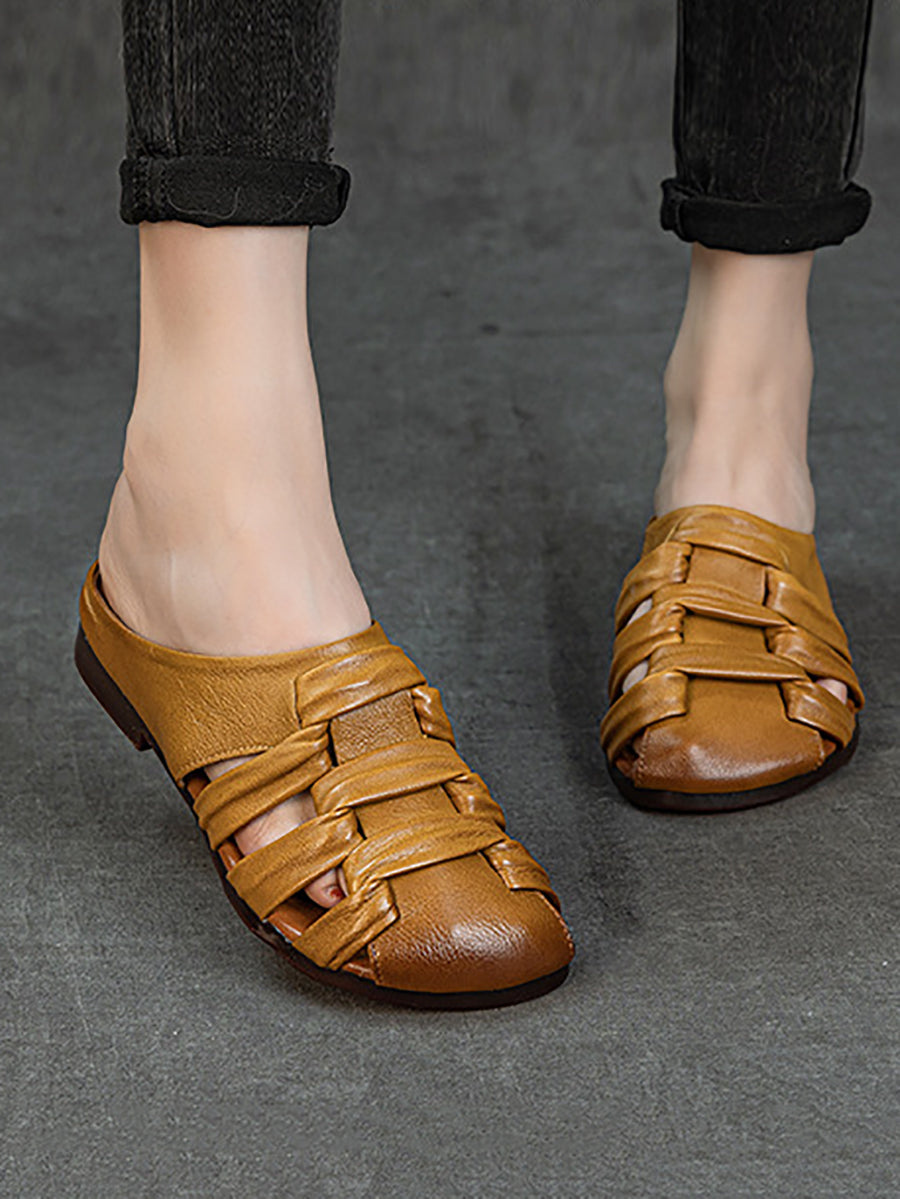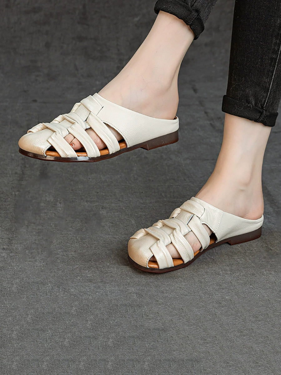 Pantoufles d'été pour femmes en cuir véritable tressé