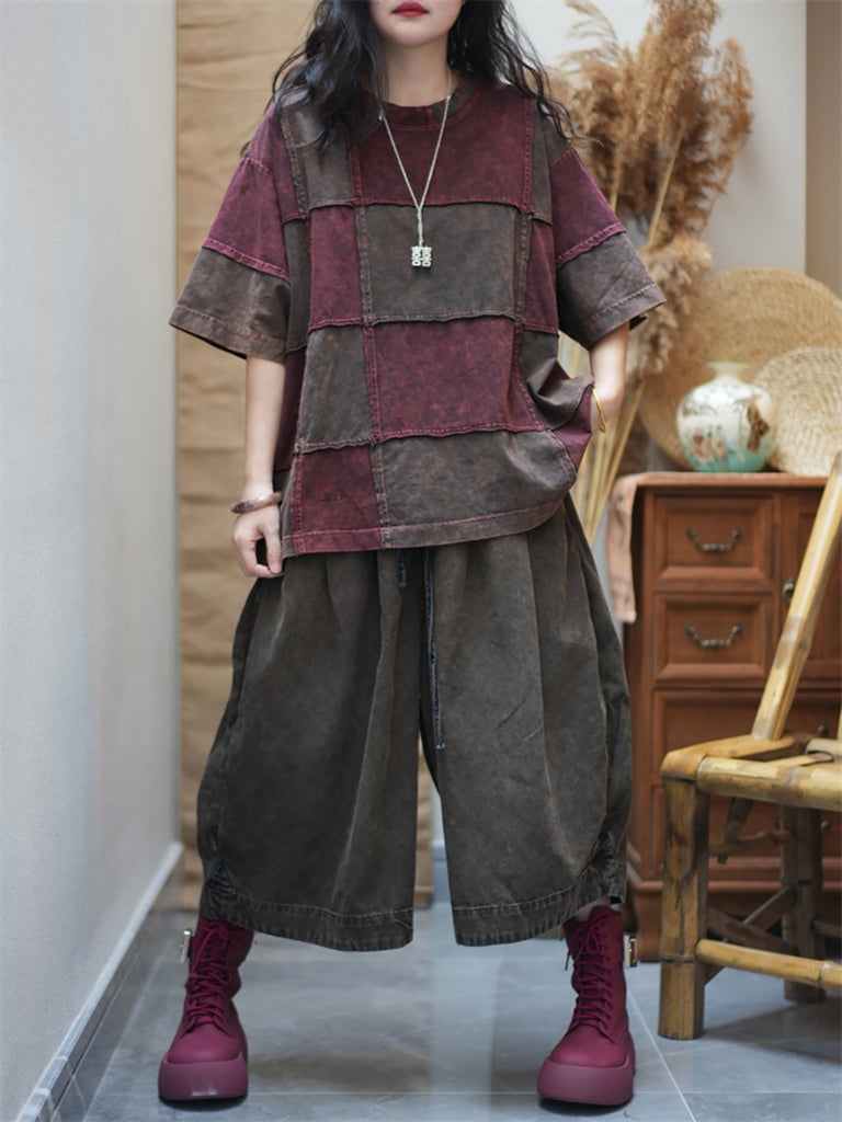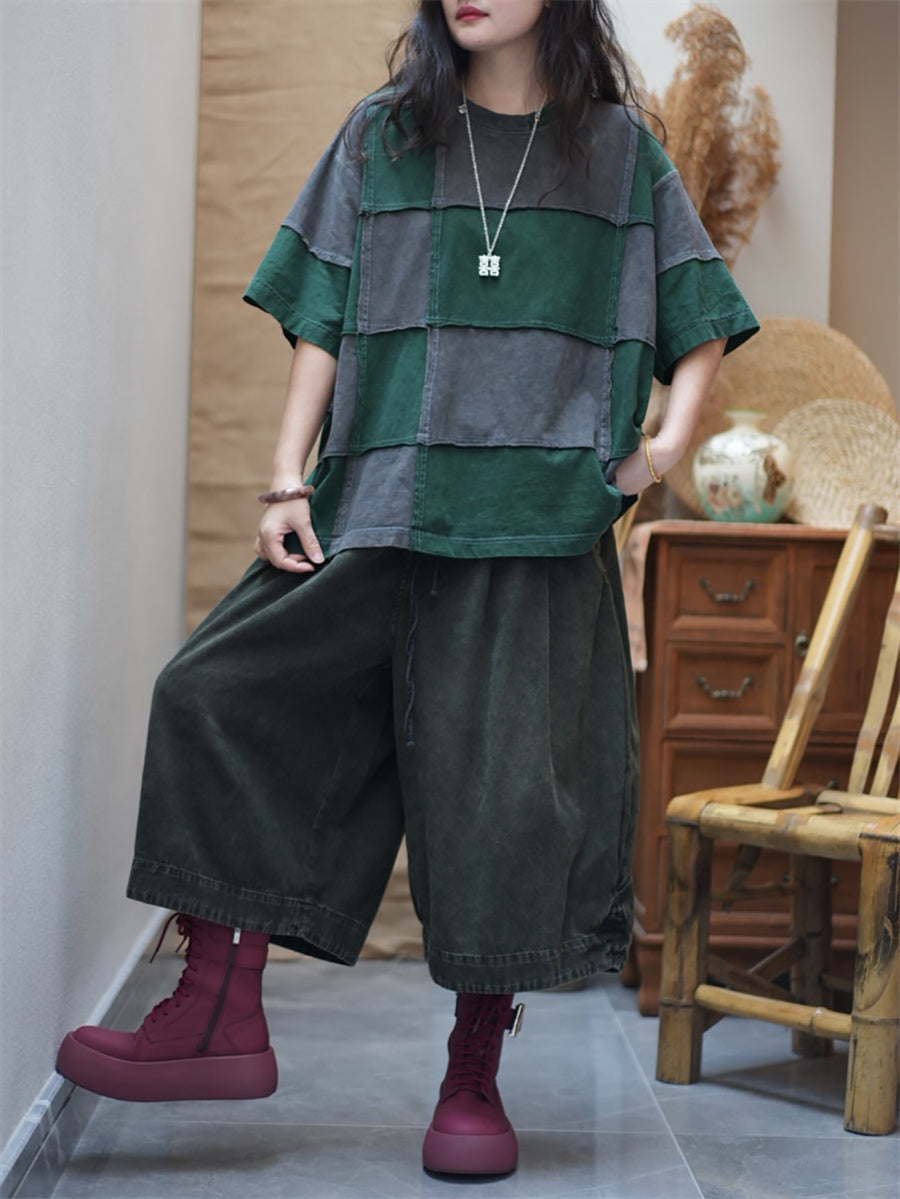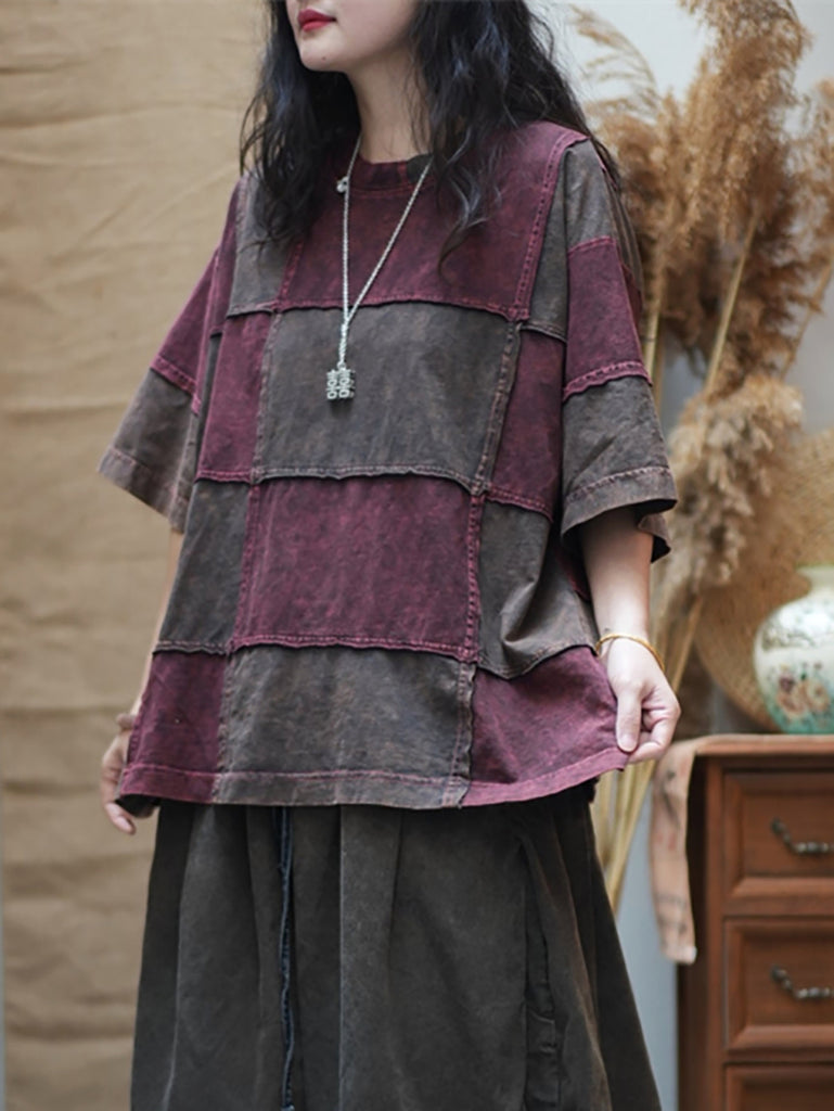 Chemise d'été en coton à col rond et carreaux rétro pour femme