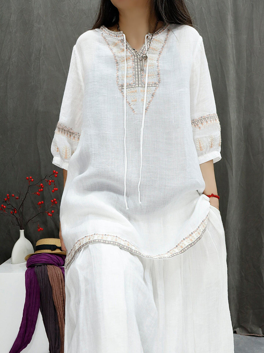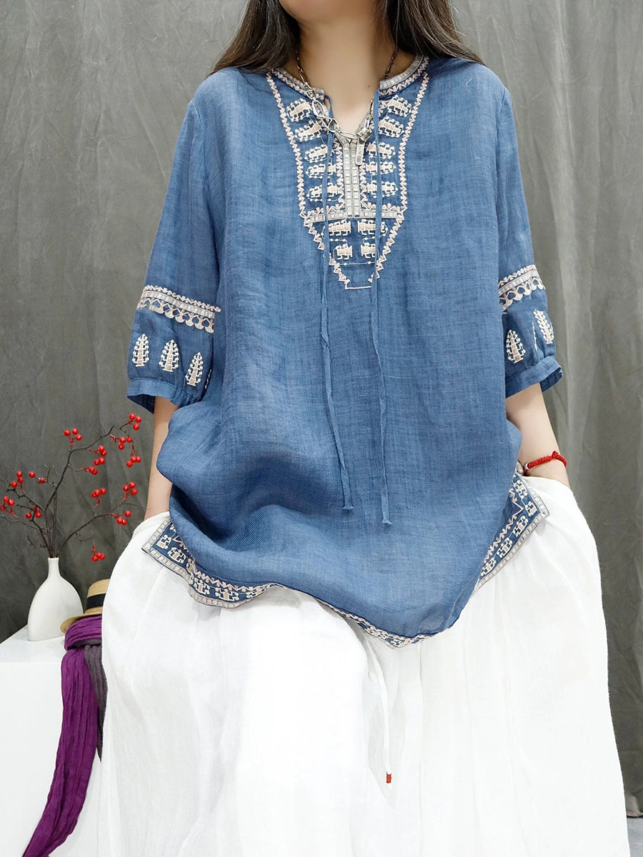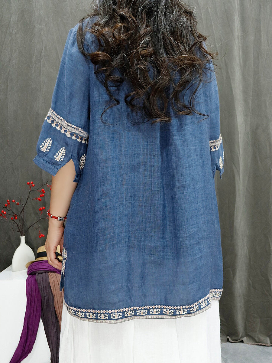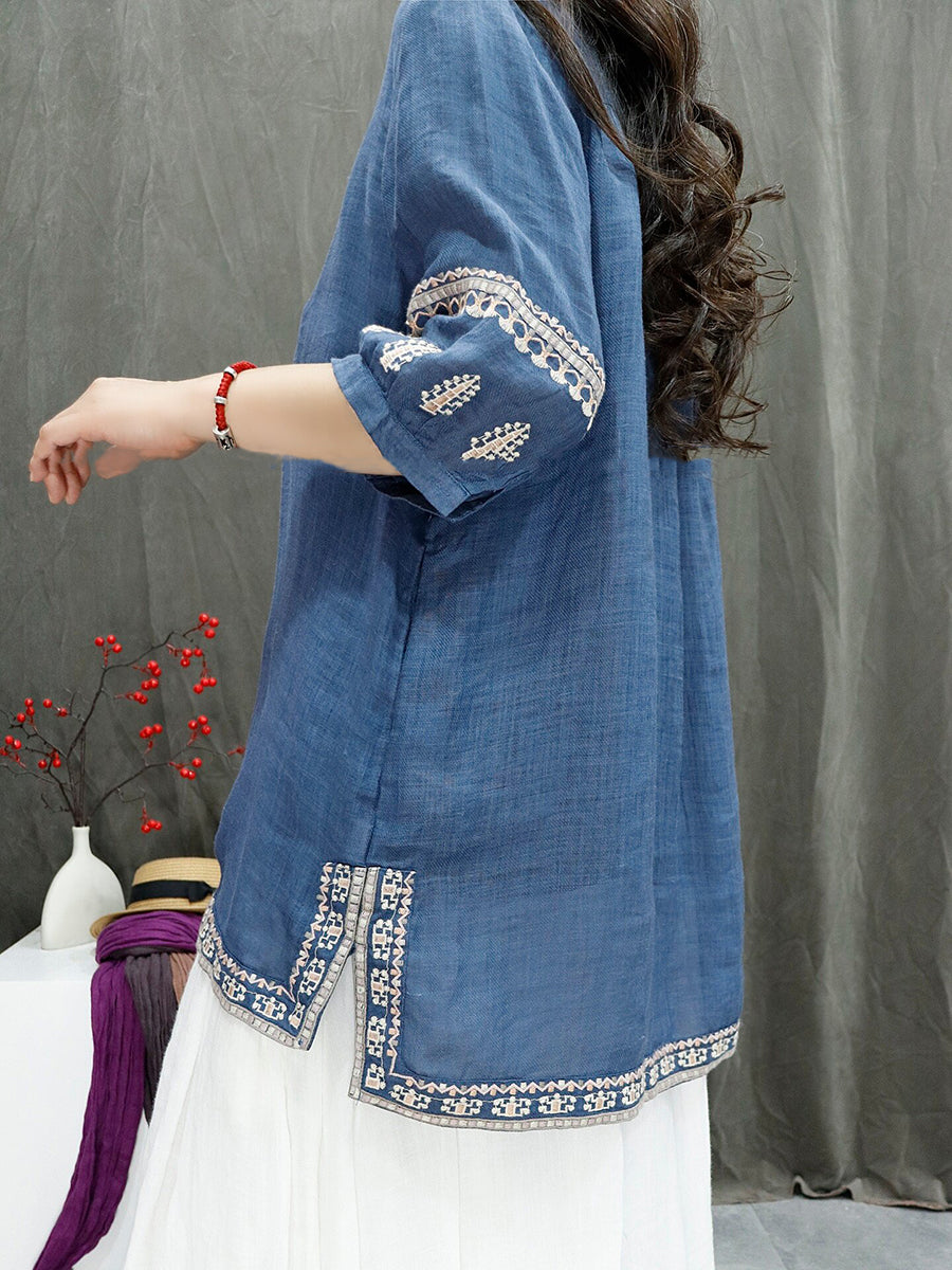 Blouse d'été rétro brodée pour femme, 100 % ramie
