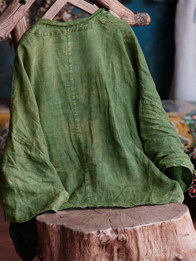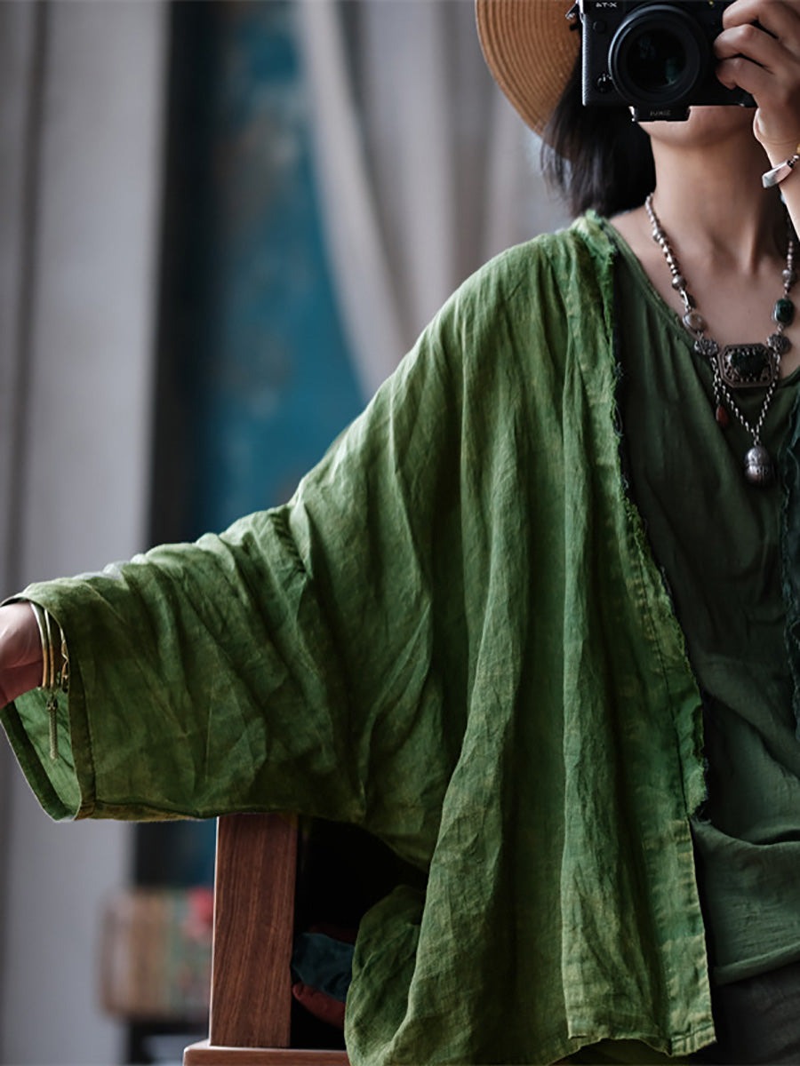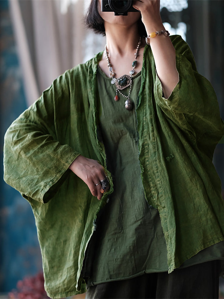 Ce manteau est fait de 100% lin, avec un motif uni et un col en V. Les manches raglan sur toute la longueur ajoutent une touche vintage, le rendant parfait pour les saisons printemps et été.