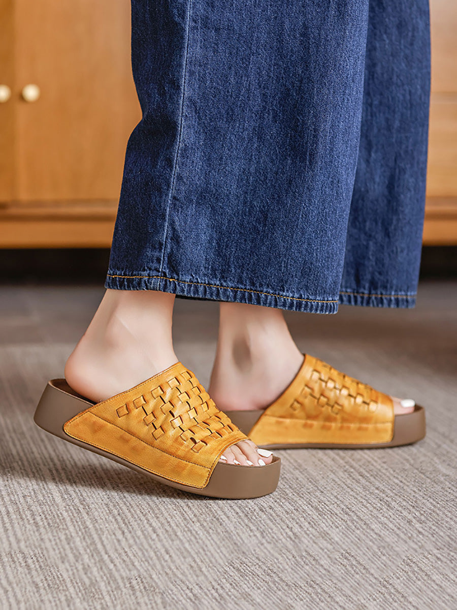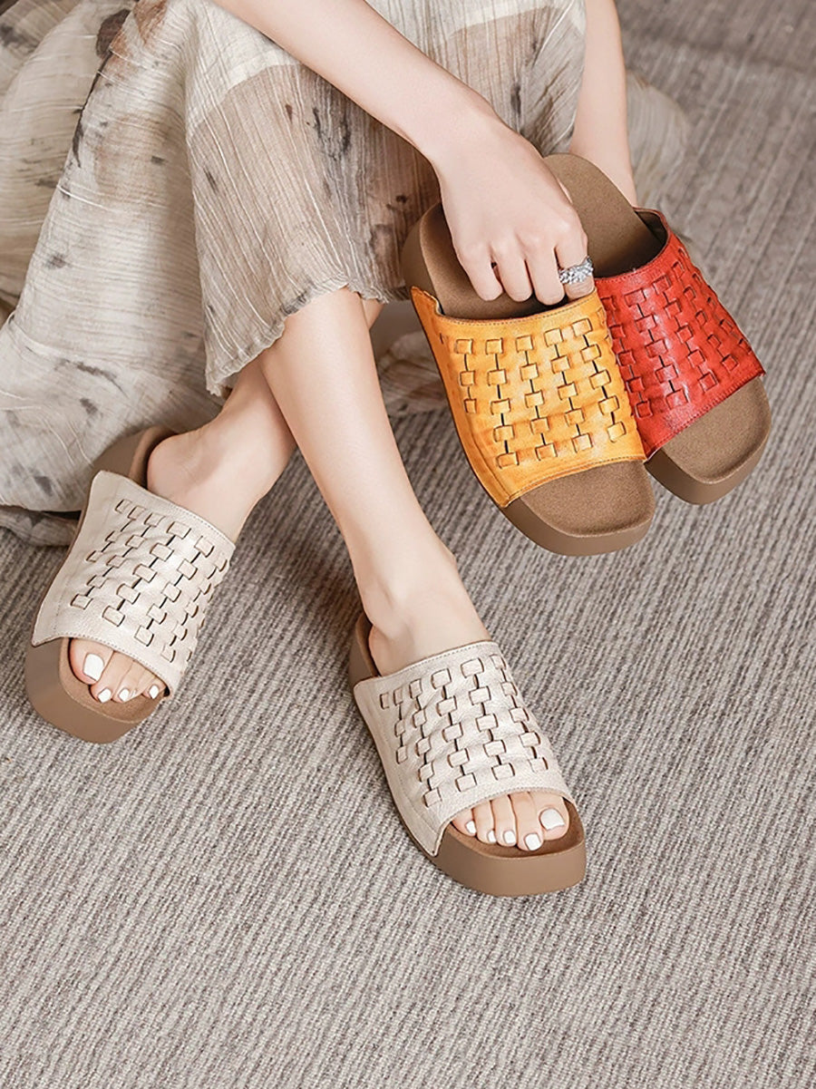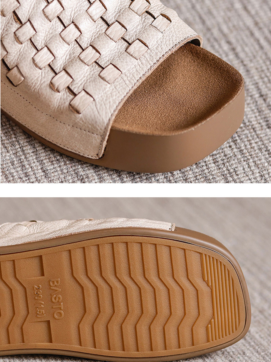 Pantoufles d'été pour femmes en cuir véritable souple tressé