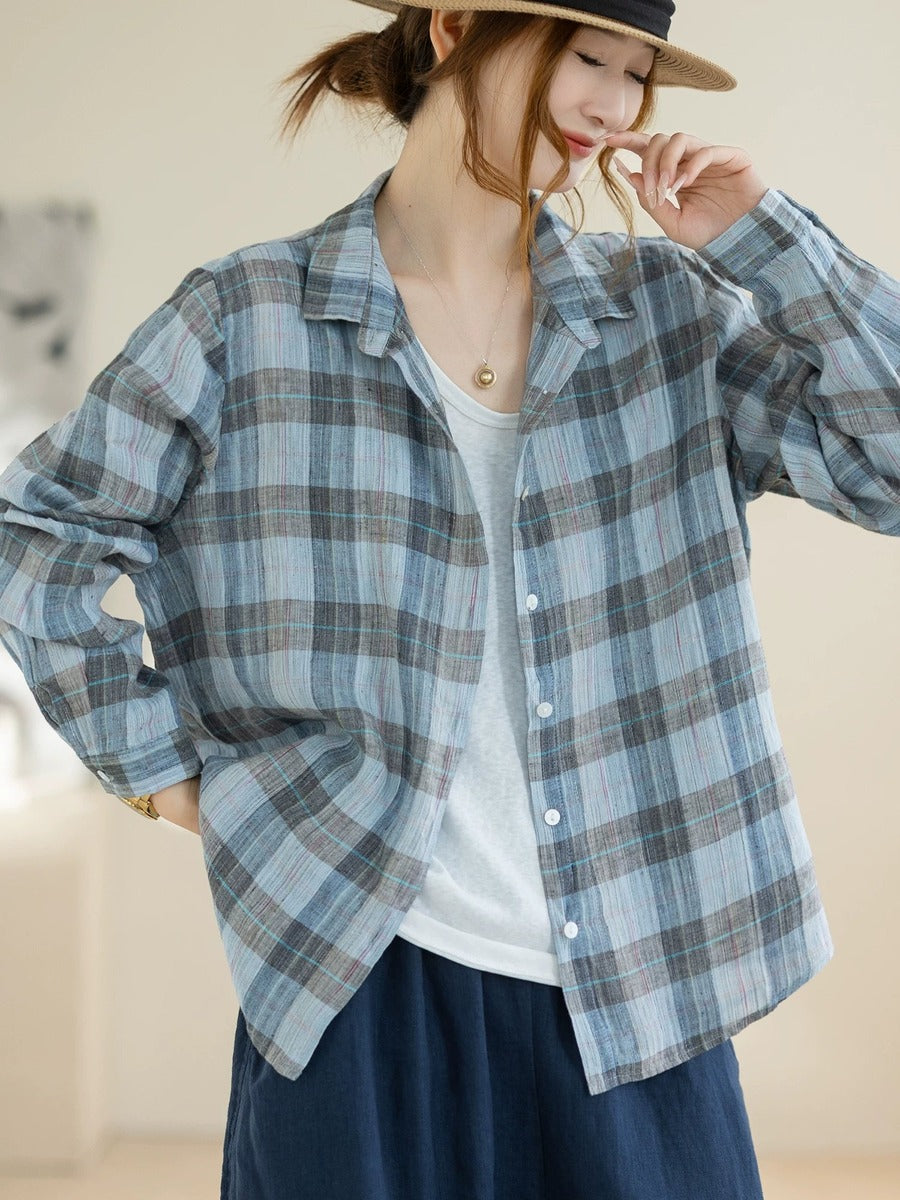 Chemise à carreaux vintage d'été pour femme, 100 % lin.