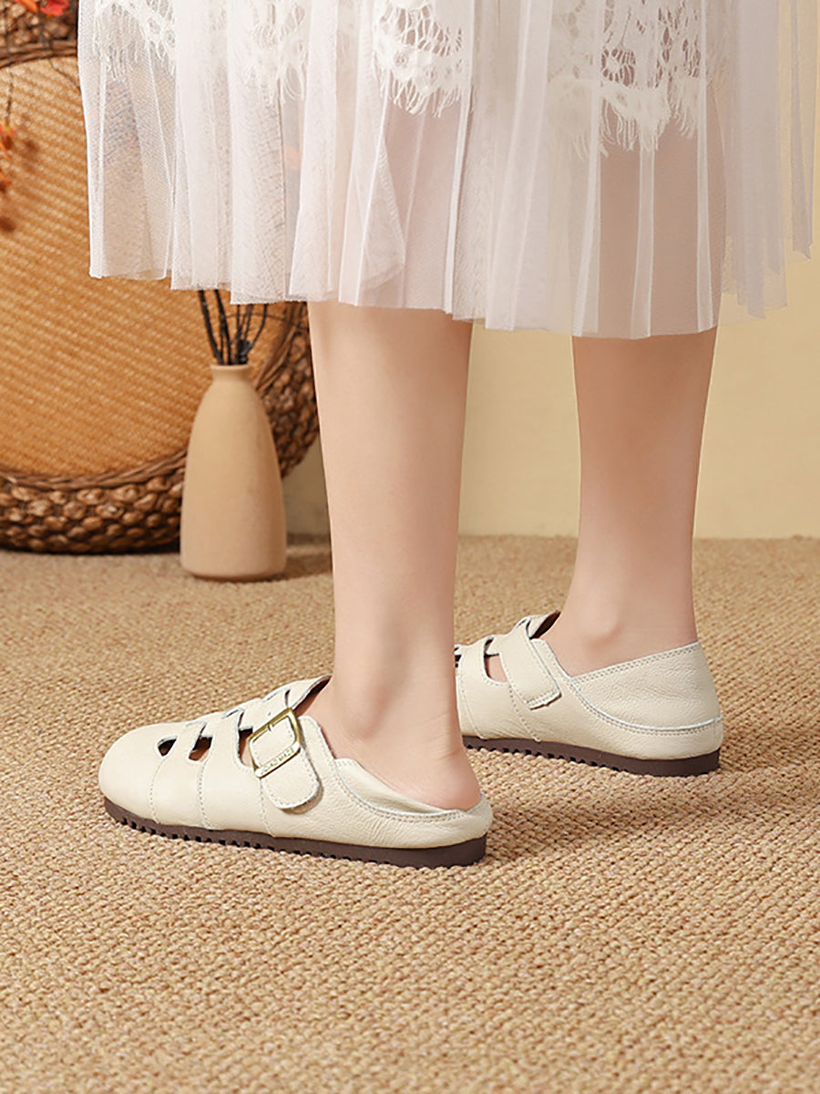 Sandales plates d'été vintage pour femmes en cuir véritable