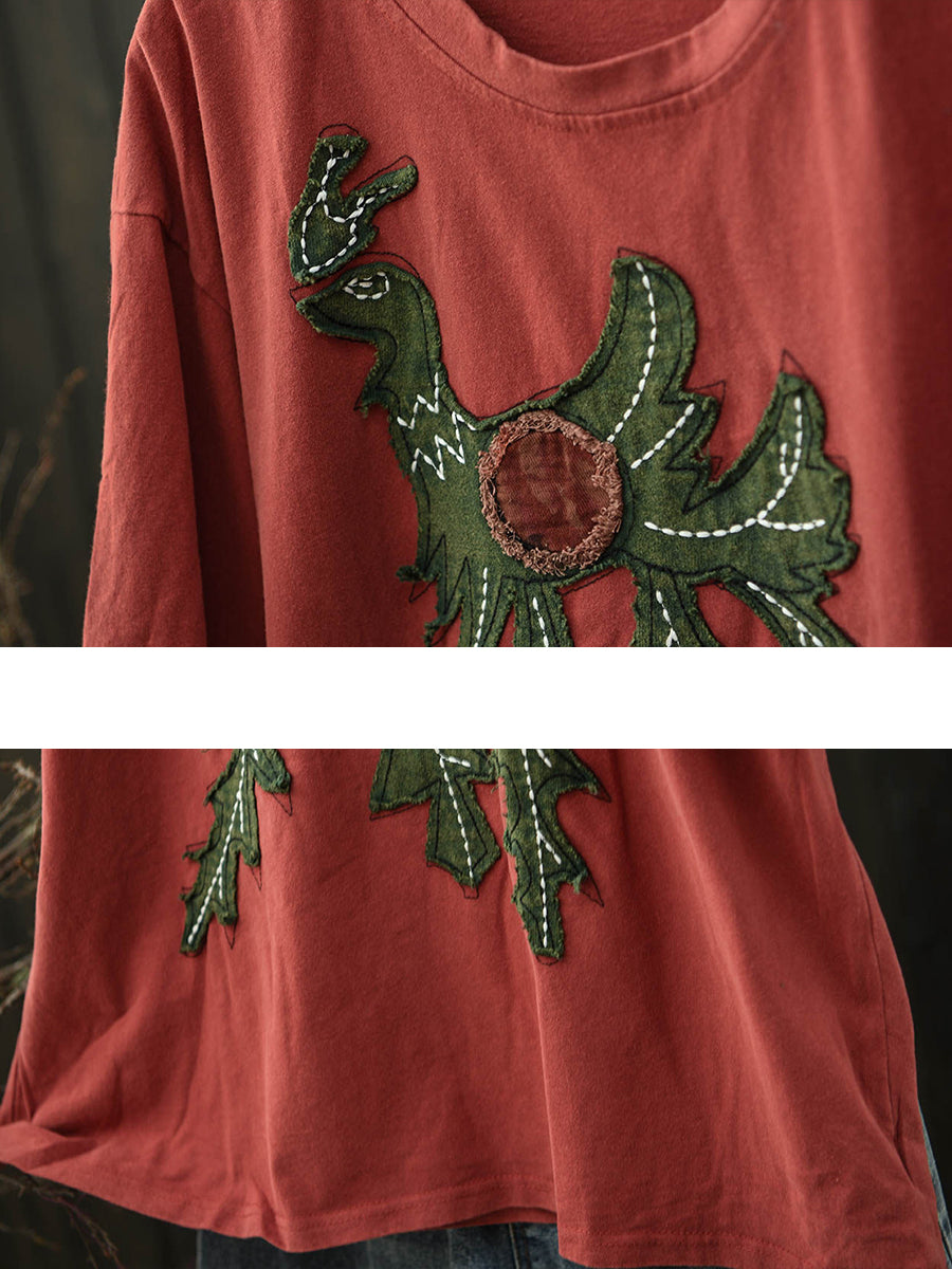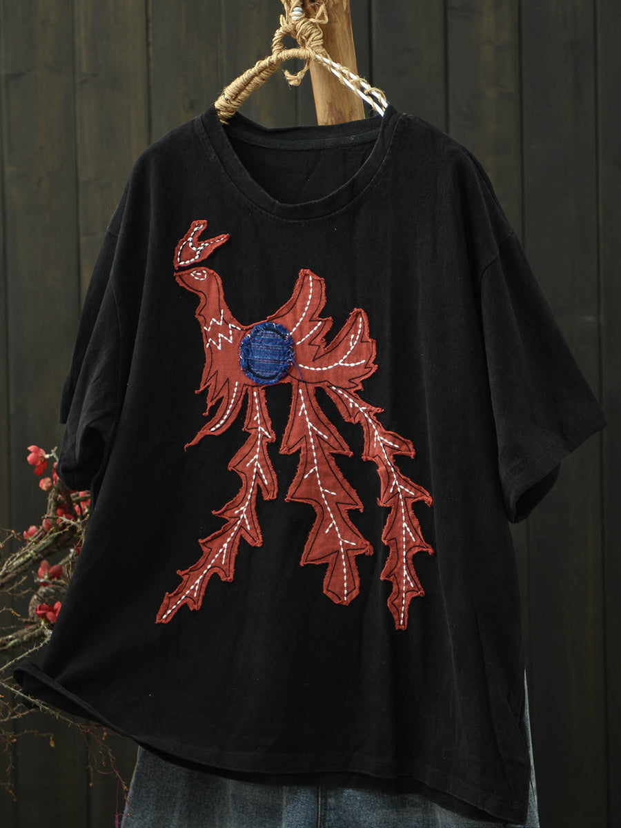 T-shirt d'été vintage patchwork en coton à col rond pour femme