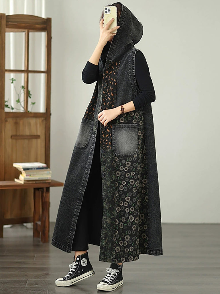Manteau à capuche en denim vintage pour femme avec fleurs