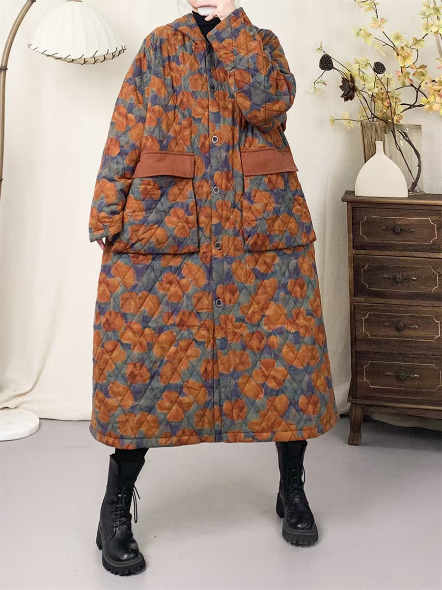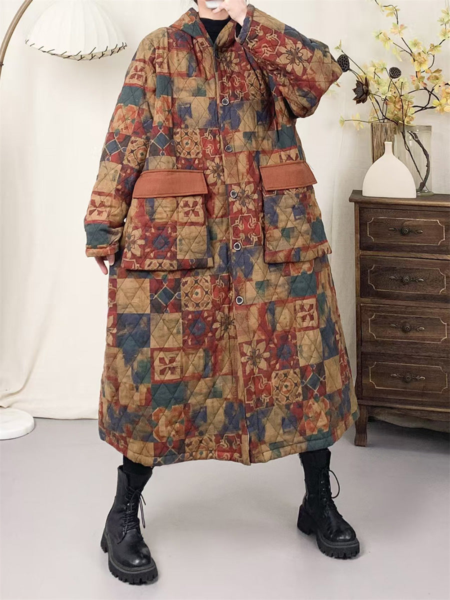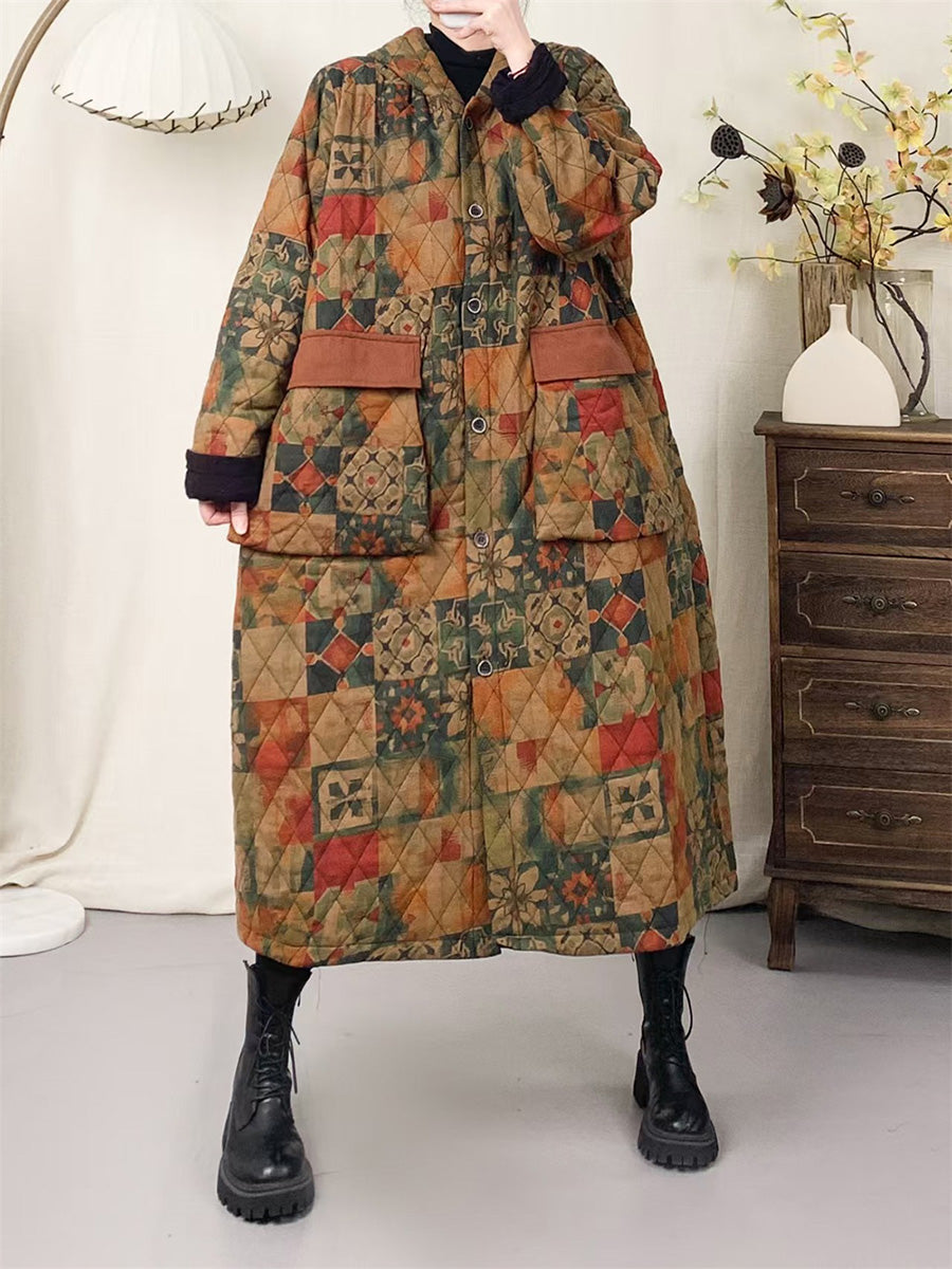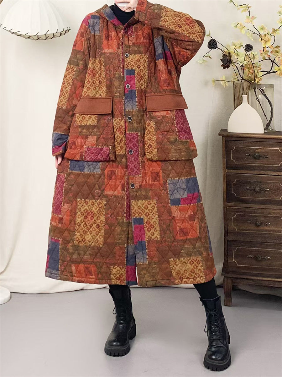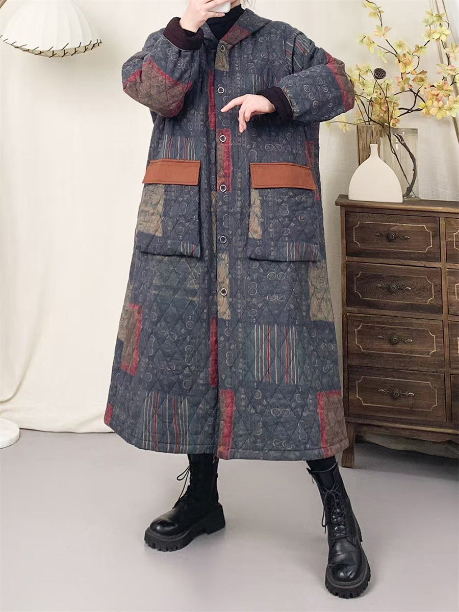 Manteau d'hiver pour femme en coton à capuche rembourrée et patchwork artistique