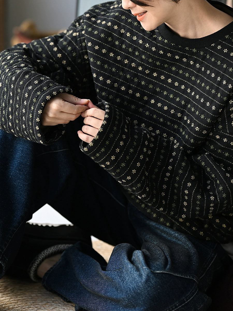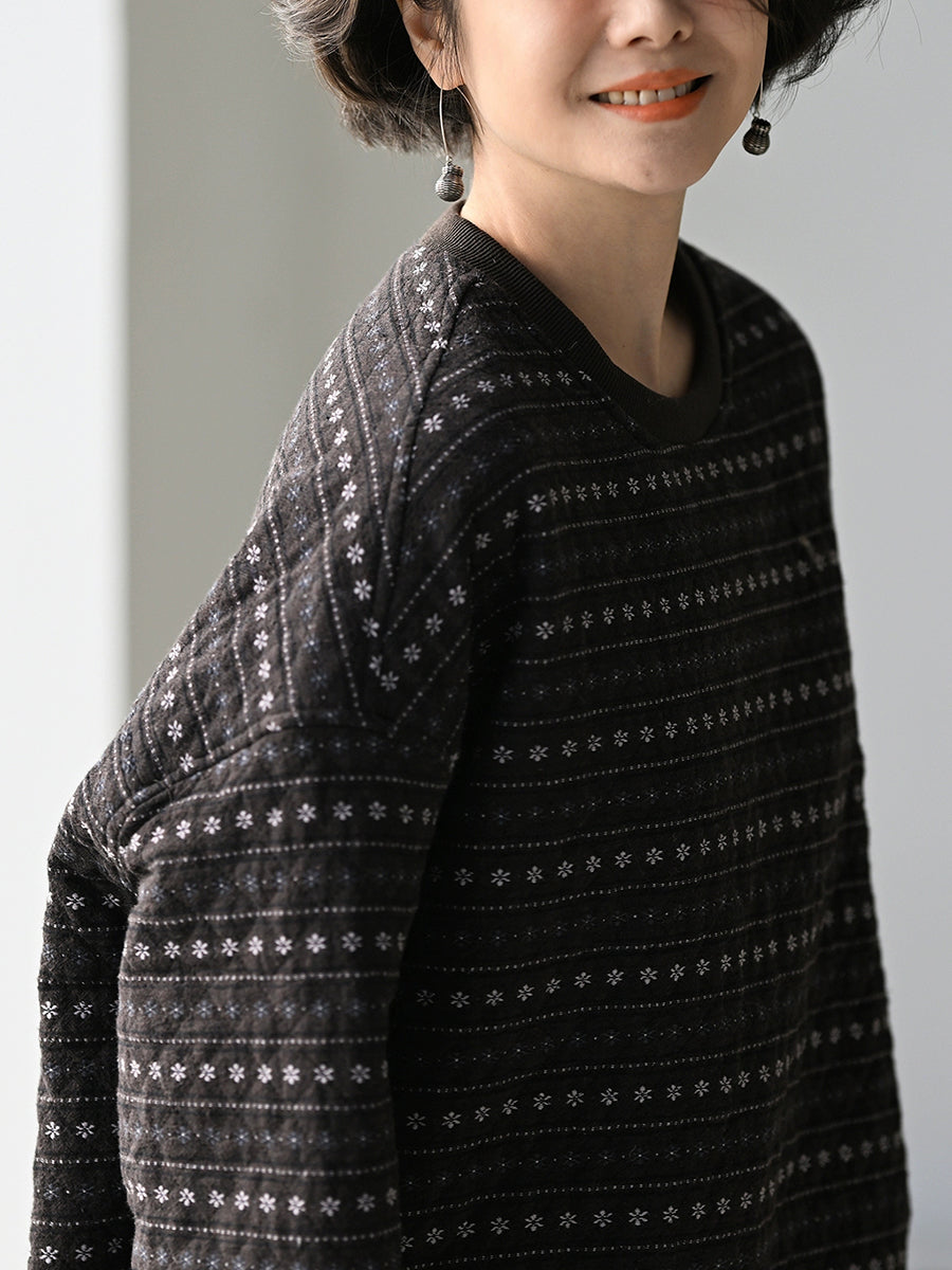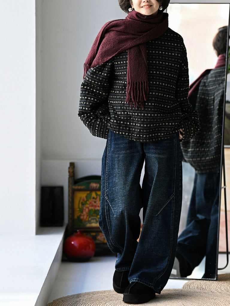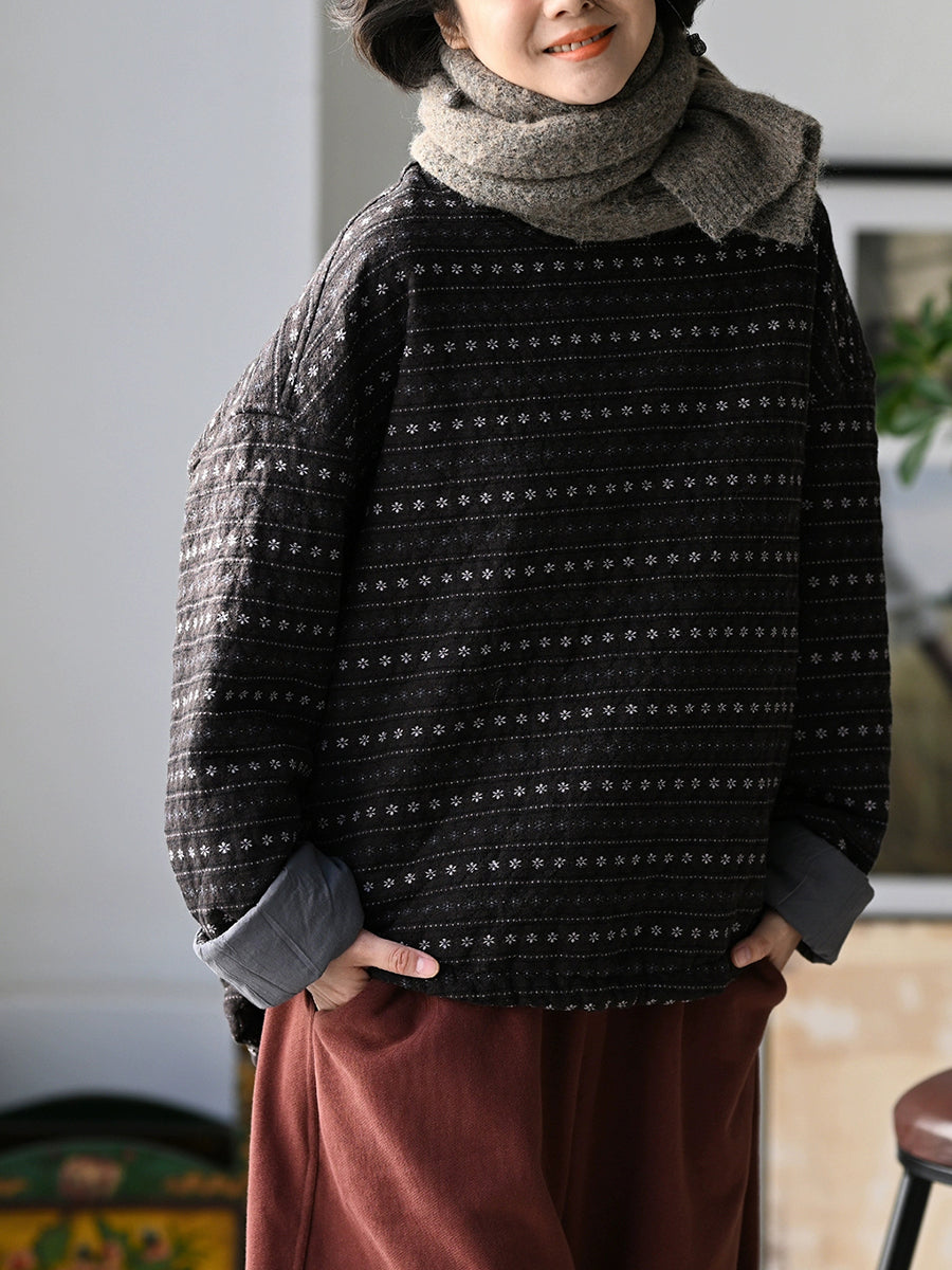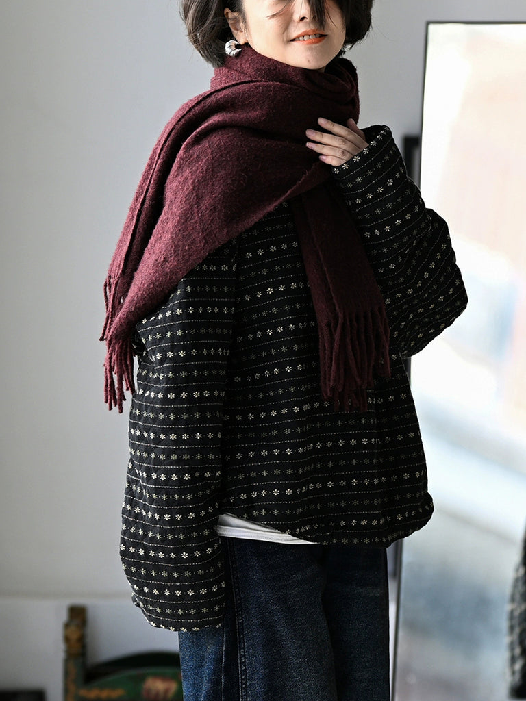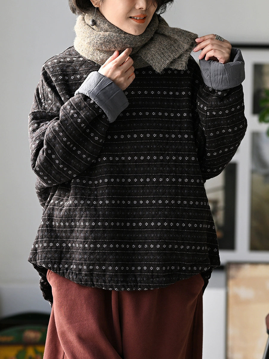 Manteau d'hiver rétro à rayures florales et col rond rembourré pour femme